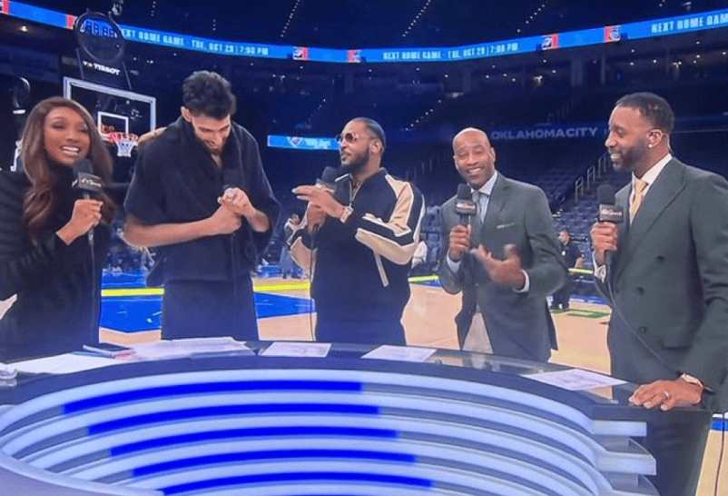 賽后,卡特切特-霍姆格倫在接受采訪時,向嘉賓安東尼、文斯-卡特和特雷西-麥克格雷迪展示冠軍戒指。