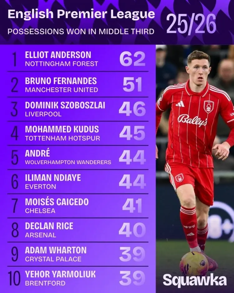 Squawka統(tǒng)計了本賽季球員在英超中場區(qū)域(中場三區(qū))奪得球權(quán)的次數(shù),并列出榜單,域奪安德森62次居首,得球B費(fèi)、權(quán)榜索博斯洛伊排名二三位。安德