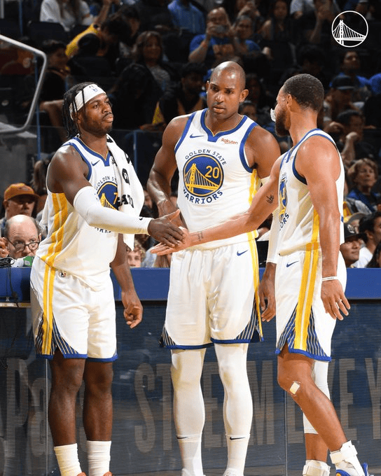 勇士官方曬出庫里、霍福德、希爾德三人同框賽場照,并附文:“7??20??30!”