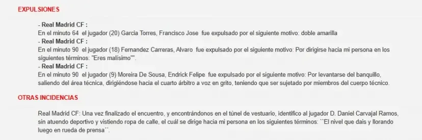 在第90分鐘,卡雷拉斯直紅被驅(qū)逐,而比賽記錄附上了一句原話,代表了皇馬方面的情緒爆發(fā):“你太糟糕了(Eres malísimo)”。比賽記錄還指出恩德里克被罰下的原因:他離開替補席,跑向第四官員大喊大叫,并且最終需要被教練組成員拉住。