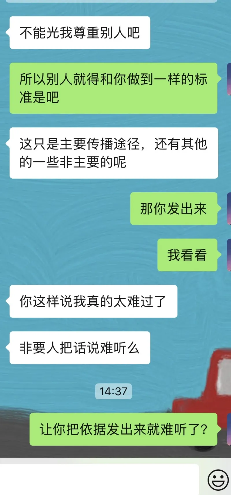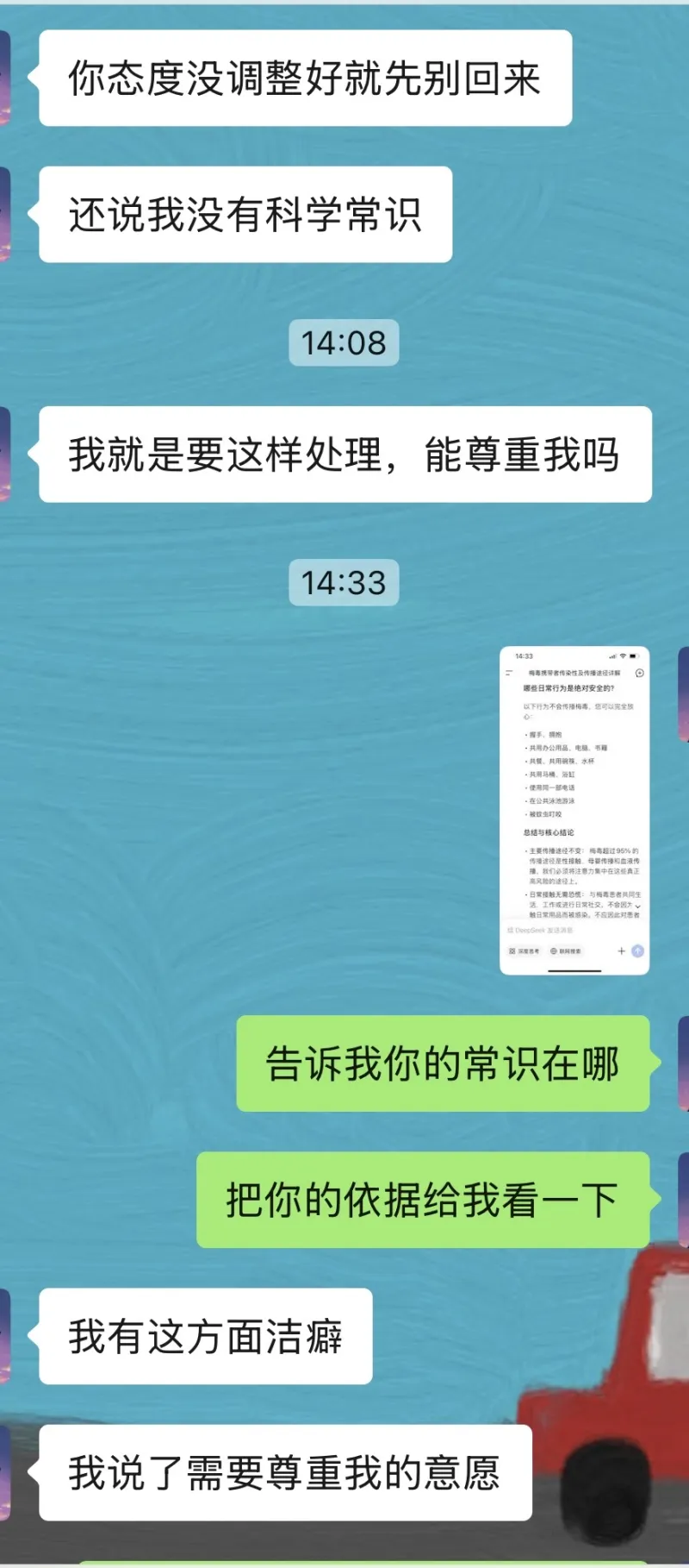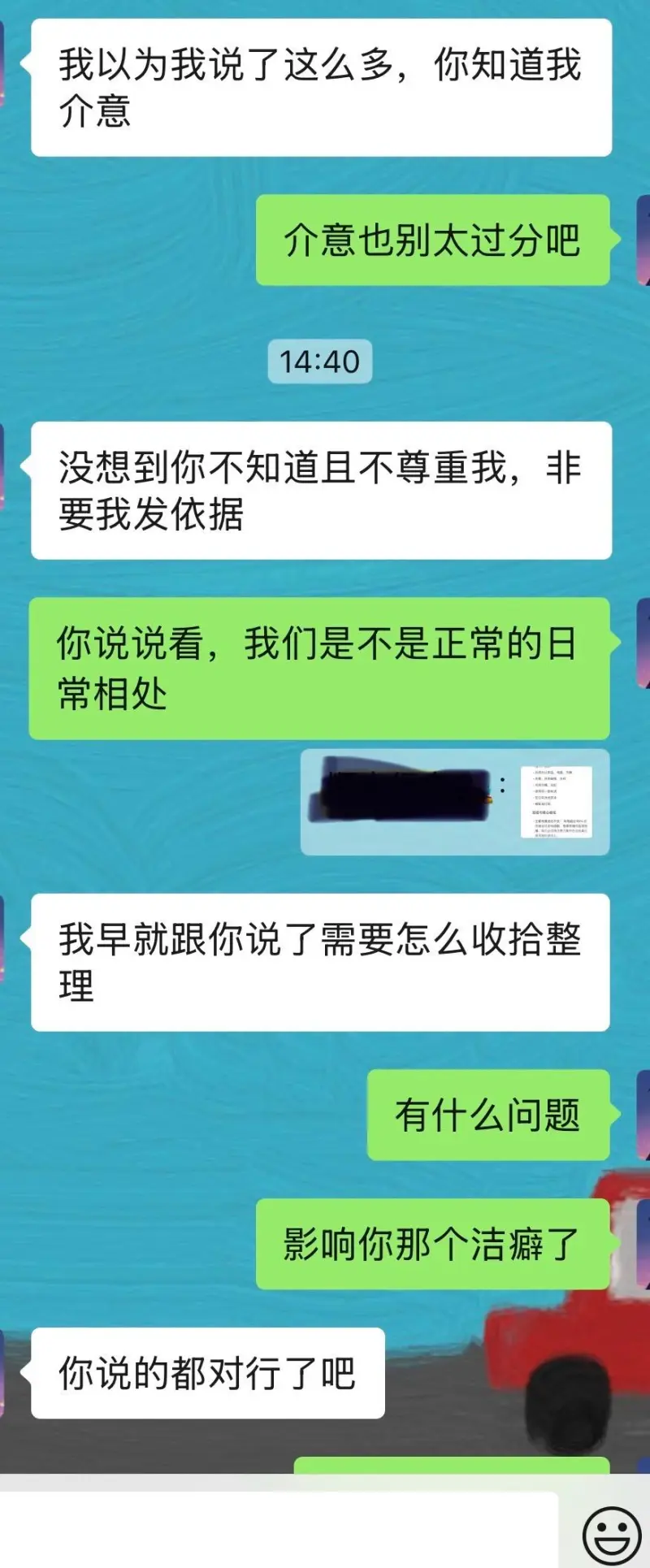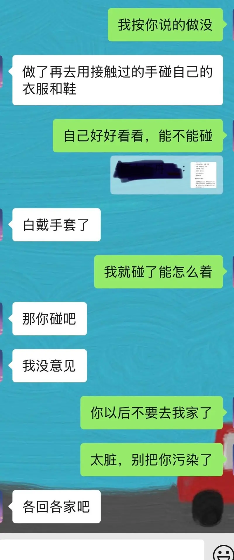 今天我媳婦找了保潔要對家里消毒,還讓我一起把我母親用過的床單枕巾等東西扔掉,收拾的過程中讓我?guī)痔祝谖覝蕚湎聵侨訓|西的時候矛盾爆發(fā)了,因為我穿鞋時帶著手套,她看見就不樂意了,質(zhì)疑我為什么戴著手套還碰自己的鞋,我當時有些莫名其妙,覺得是不是有些過了,就有了后面的對話。