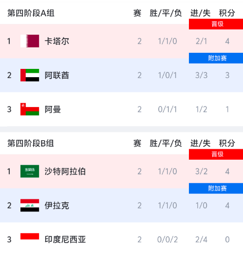 阿聯(lián)酋、伊拉克獲得小組第二,將進(jìn)入第五階段爭(zhēng)奪一個(gè)參加洲際附加賽的名額。