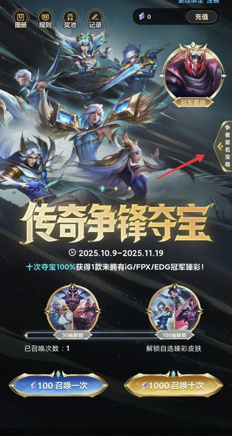 抽冠軍臻彩那個頁面,右上角有個爭者留名寶箱可以開