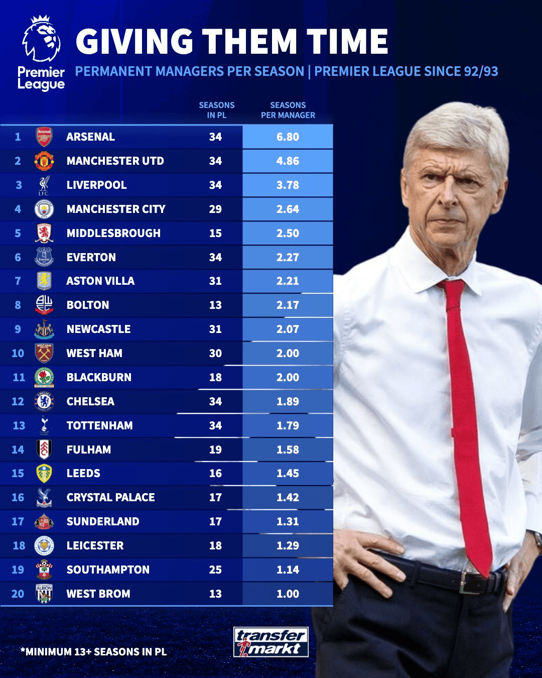 4、隊歷曼城,任主29個賽季,帥平森納2.64個賽季