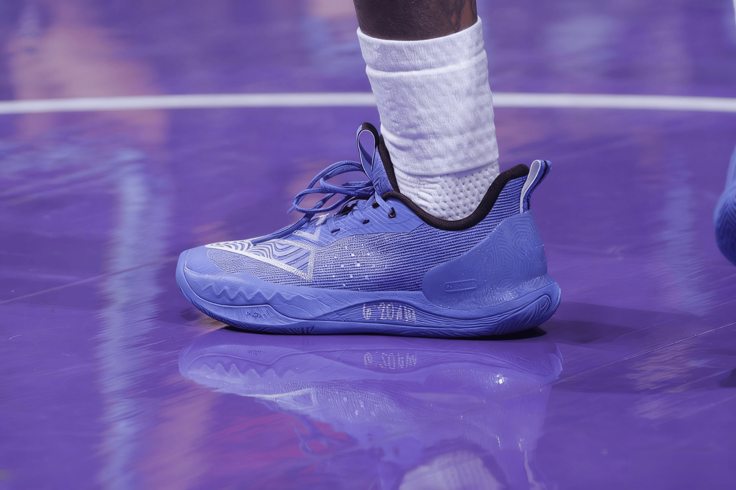 比賽中,著藍助攻蒙克上腳藍色匹克 態(tài)極大三角4.0 PE。色匹