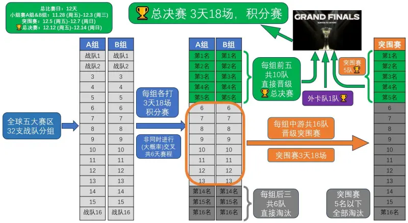11.24-11.26,3天高排位種子隊(duì)高級(jí)資格賽,各賽區(qū)15支頂級(jí)戰(zhàn)隊(duì)+1支東道主外卡,前8直接晉級(jí)總決賽;