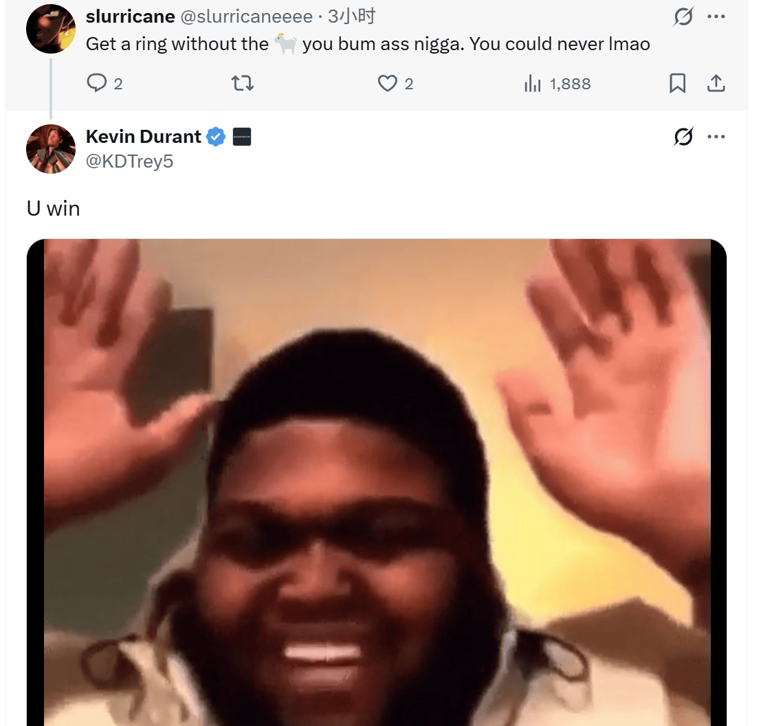 虎撲11月05日訊 今日,火箭球員凱文-杜蘭特在網(wǎng)上與網(wǎng)友互動。友離贏