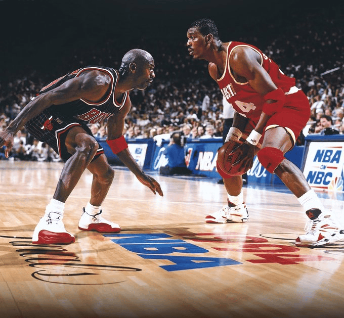 美媒fliff曬出喬丹和奧拉朱旺的旺美晚照片,并調侃道:“這是媒調今晚的亞歷山大vs申京。”