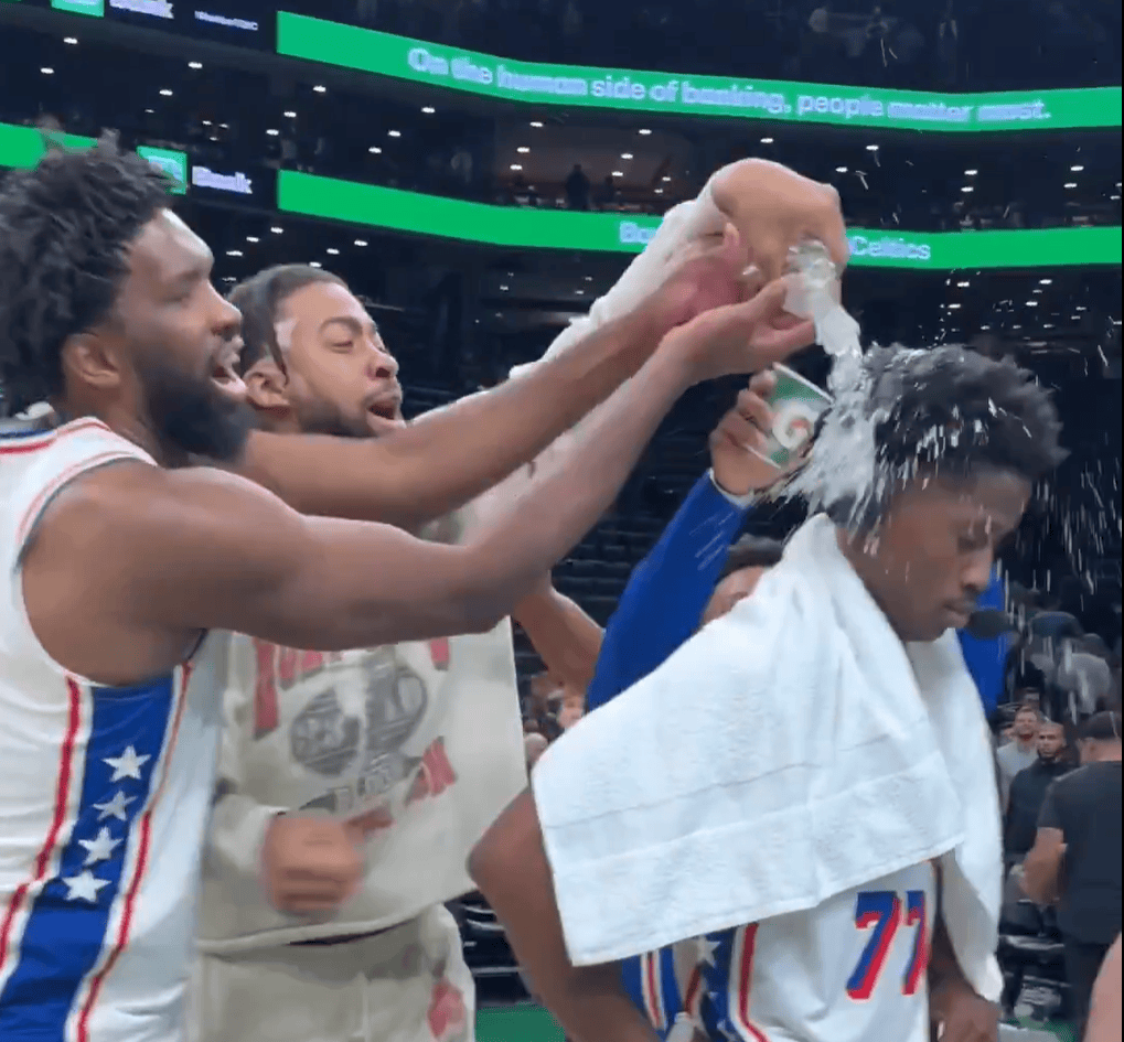 賽后,本場(chǎng)比賽發(fā)揮出色的新秀VJ-埃其庫(kù)姆在場(chǎng)邊接受采訪,喬爾-恩比德與隊(duì)友一同給其澆水,并興奮慶祝。