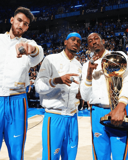 對此,頭陣NBA官方曬出了雷霆球員切特-霍姆格倫、流言雷霆亞歷山大和杰倫-威廉姆斯展示總冠軍戒指的官方照片。