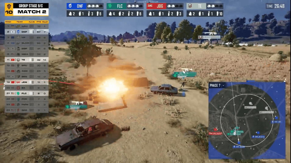 階段6,圈型刷在養(yǎng)雞場北部麥田。TE兩人進攻FOR方向,依靠TanVuu亮眼發(fā)揮,F(xiàn)OR先被淘汰出局,隨后4AM兩人也被TE淘汰。階段7,DNF與VP交戰(zhàn),VP被DNF與TE夾擊淘汰。