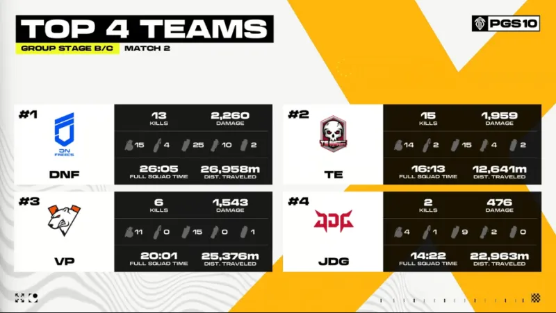 決賽圈,F(xiàn)LC三人被道具淘汰出局。組賽DNF拉開槍線將JDG淘汰。雞單局淘最終DNF與TE2v2,DNF趴伏埋伏得手,TE先被打掉一人,最后一人也被鎖定位置,被DNF淘汰,DNF成功吃雞。