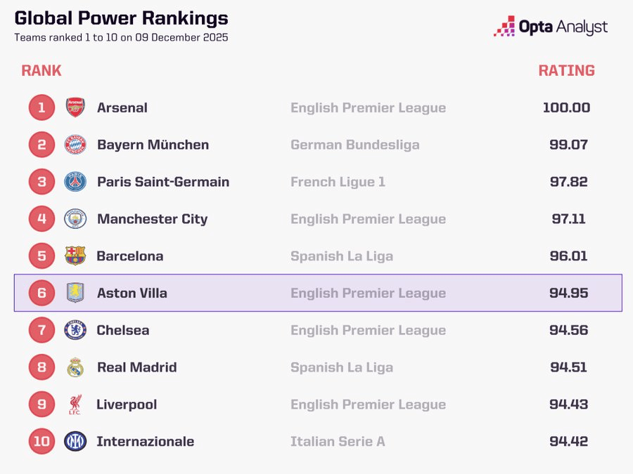 虎撲12月09日訊 著名統(tǒng)計機構(gòu)更新了現(xiàn)階段全球俱樂部實力排名,其中阿森納100分居首,全球拜仁巴黎前三。俱樂