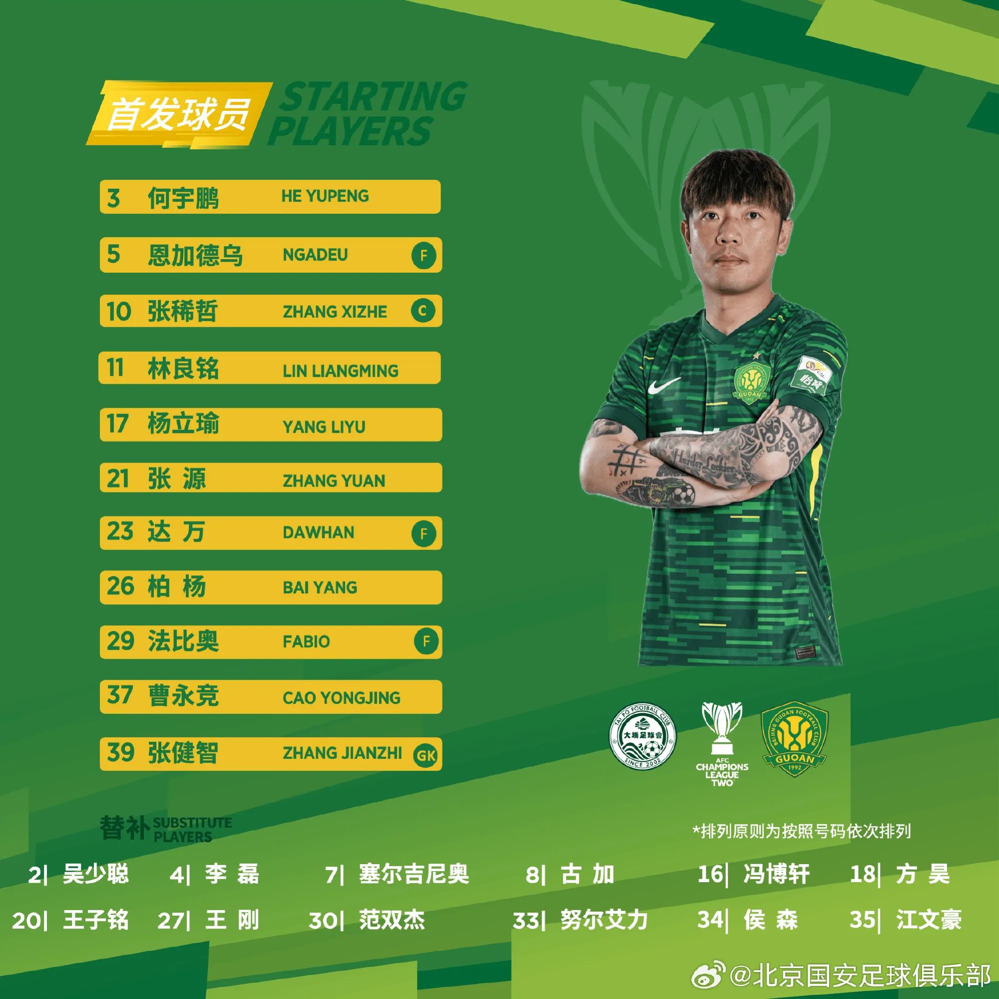北京國安首發(fā):39-張健智、出戰(zhàn)3-何宇鵬、板國比奧26-柏楊、埔首5-恩加德烏、發(fā)門37-曹永競、將張健智23-達(dá)萬、首秀21-張?jiān)础埾≌芊?0-張稀哲、出戰(zhàn)29-法比奧、板國比奧11-林良銘、17-楊立瑜