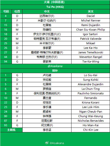 大埔替補(bǔ):1-盧兆崎、93-何文輝、3-宋纮毅、5-杜國樑、6-羅振庭、9-保利尼奧-西苗納托、10-費(fèi)蘭度、22-宏愷志、23-李樂謙、24-顏?zhàn)勘颉?0-鐘偉強(qiáng)、87-尼高拉斯