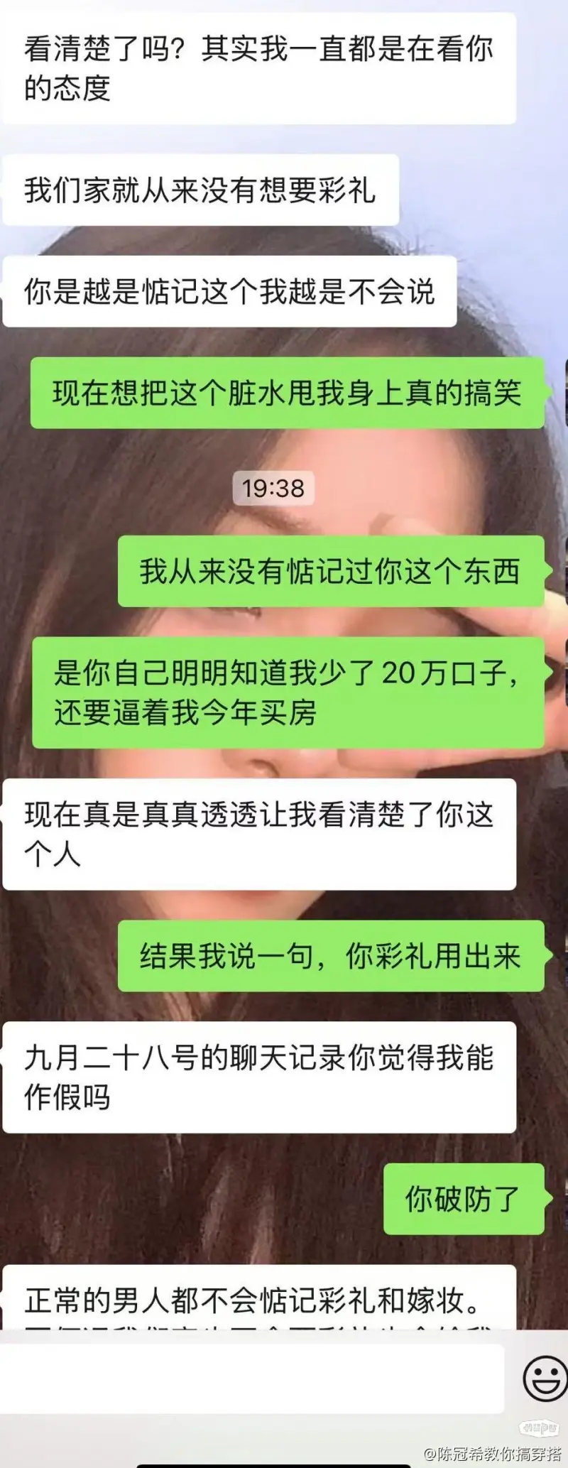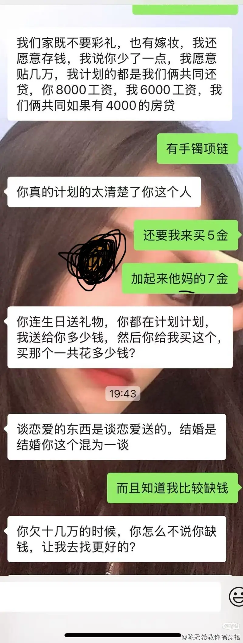 樓主和女友在一起五年了,也去她家去過兩次 22年的彩禮時候因?yàn)楦愎举I了一個A4給她開 自己至今沒有駕照 當(dāng)時她一直想要我把車過戶給她 我一直不肯 她說自己閨蜜什么奔馳e老公過給她后面也沒過,什么都是現(xiàn)談比較 談戀愛期間給她 買蘋果手機(jī) 買金項(xiàng)鏈 手鐲 她治牙 還花了兩萬多都是我出的錢她也沒有還錢給我的表示 我也沒問這個,樓主今年28了她26 家里也都在催 讓我在省會買房子 現(xiàn)在公司業(yè)績也不太好。彩禮 買房子還要18.8彩禮 而且她沒有嫁妝回 因?yàn)楝F(xiàn)在 總共只拿得出四十萬 給了彩禮就沒辦法結(jié)婚。現(xiàn)談我問她說嫁妝她就說自己家里沒錢 彩禮她家不要 是彩禮她自己要。現(xiàn)在車子還在她哪里 接下來都不知道怎么辦了 談戀愛花在多錢 結(jié)婚一分都不能少