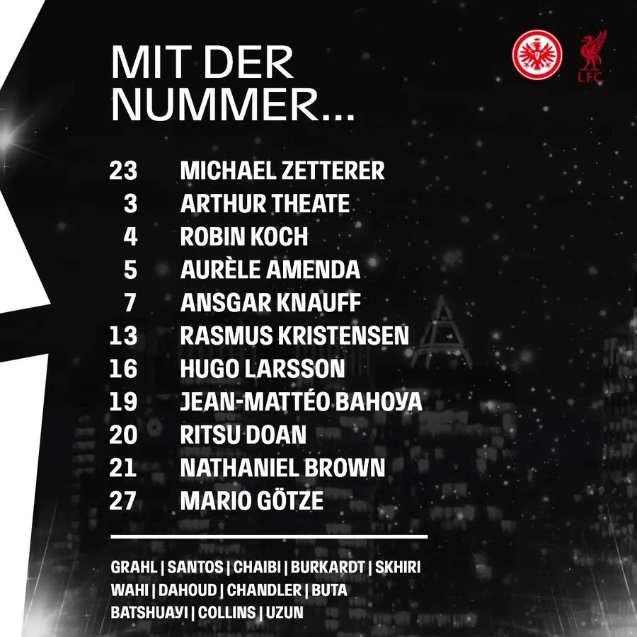 法蘭克福替補:33-格拉爾、40-桑托斯、24-布塔、34-科林斯、15-斯希里、18-達胡德、22-錢德勒、42-烏尊、8-沙伊比、9-伯卡特、17-瓦希、30-巴舒亞伊