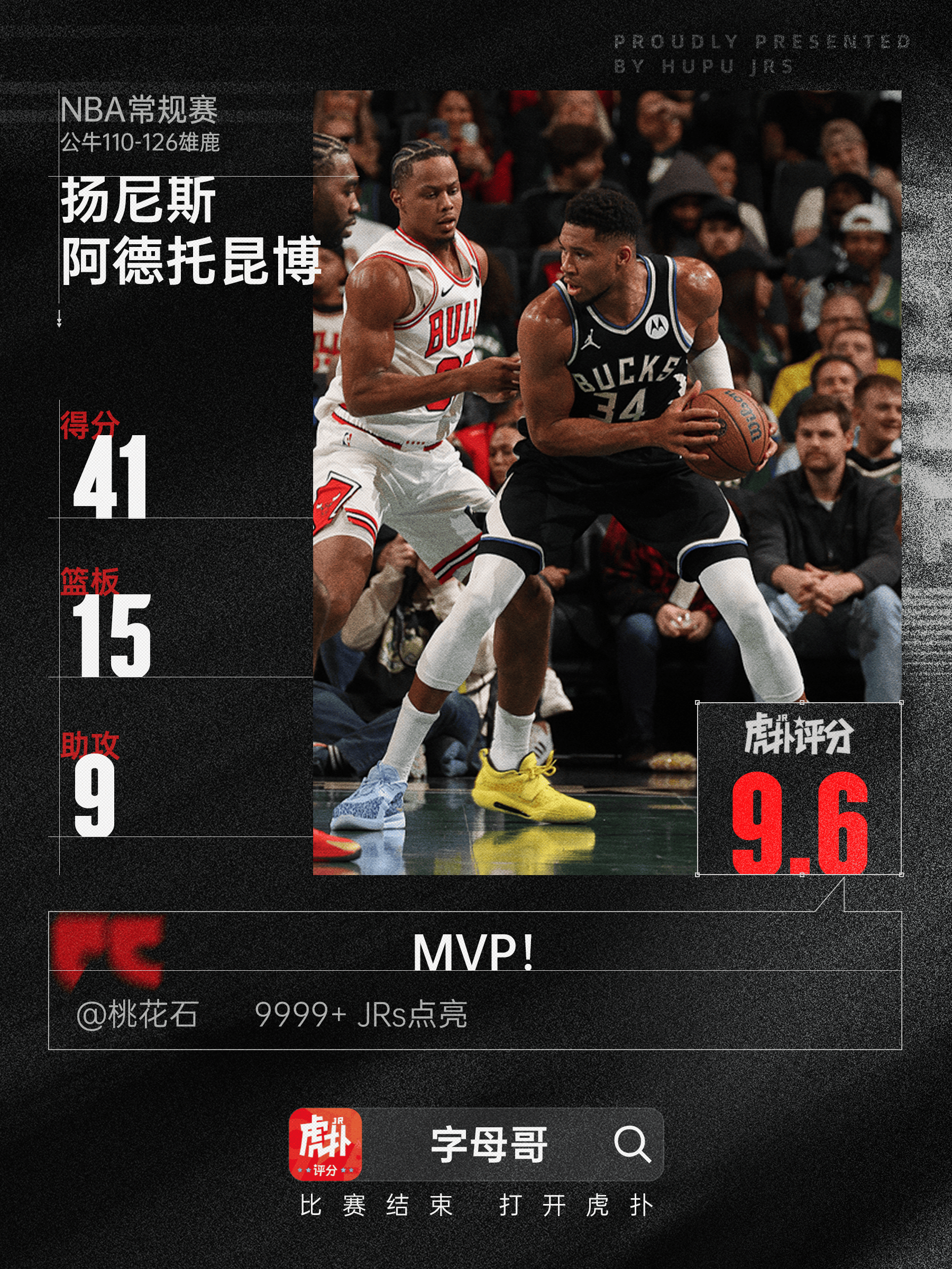 本場比賽,下分雄鹿球員揚尼斯-阿德托昆博出戰(zhàn)37分鐘,籃板32投16中,其中三分球3投1中,罰球11投8中,得到41分15籃板9助攻2搶斷2封蓋。
