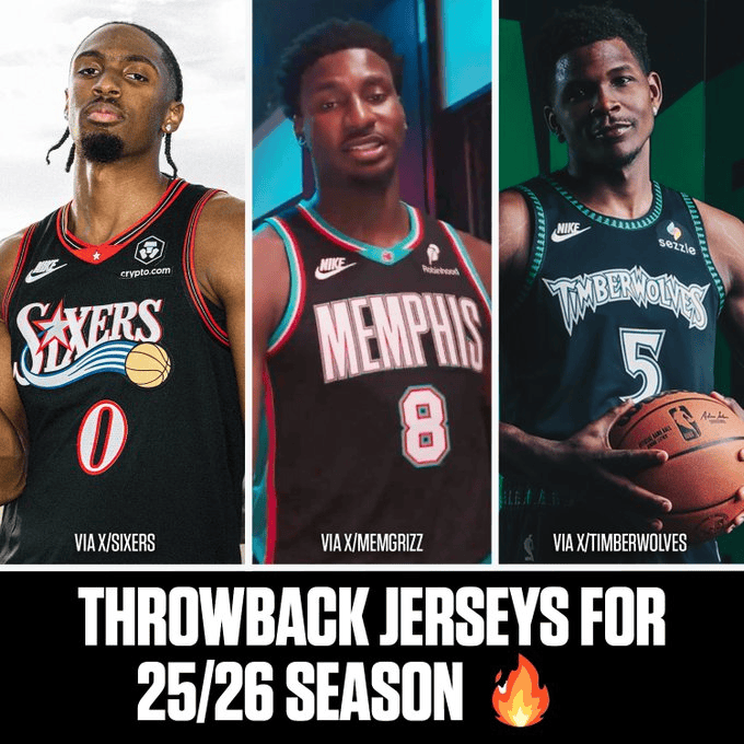 圖中的問(wèn)本三件球衣分別是76人、灰熊和森林狼的最期復(fù)古球衣。