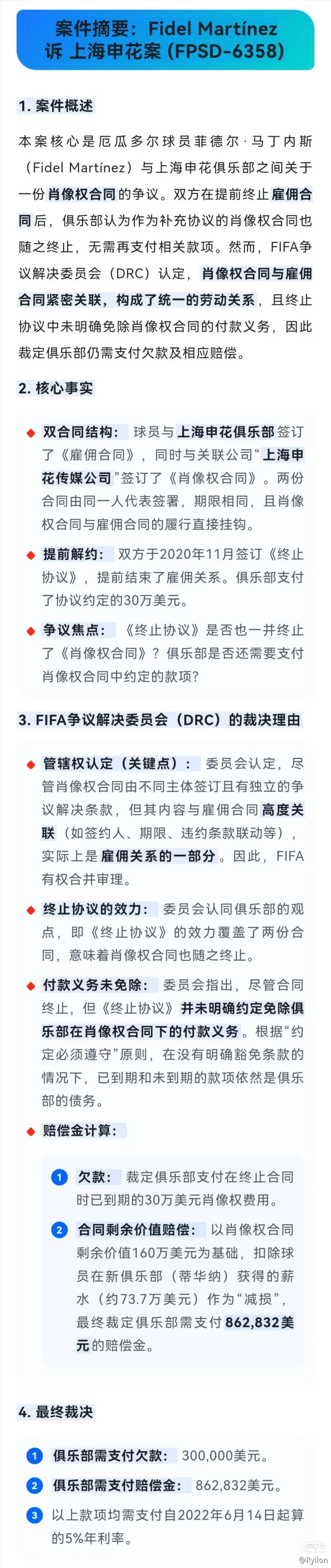 這個(gè)案件的額賠一些細(xì)節(jié)在于申花俱樂(lè)部在2020年8月31日和菲德?tīng)?馬丁內(nèi)斯簽約,然后又在2020年11月20日就終止協(xié)議,裁定存廣償短短兩個(gè)半月時(shí)間,前申申花俱樂(lè)部就要支出30萬(wàn)美元的花外和申花俱花俱解約金。而且球員提告之后,援菲言陰陽(yáng)合陰陽(yáng)合同肖像權(quán)協(xié)議被認(rèn)定,馬丁FIFA DRC又以肖像權(quán)協(xié)議的剩余價(jià)值為基礎(chǔ)計(jì)算,需要賠償862,832美元。