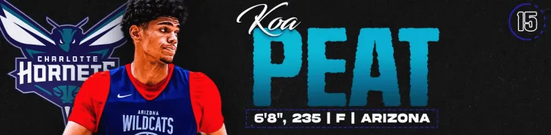 夏洛特黃蜂在2025年選秀中已獲豐厚回報(bào),本次模擬選秀中他們有望延續(xù)此趨勢(shì)。繼第七順位幸運(yùn)摘得圖恩德·耶蘇福后,球隊(duì)又于第十五順位收獲來(lái)自亞利桑那大學(xué)的"終極攻城錘"科阿·皮特。這位新生早已在對(duì)陣衛(wèi)冕冠軍佛羅里達(dá)大學(xué)時(shí)打出單場(chǎng)30+的統(tǒng)治級(jí)表現(xiàn)。皮特具備N(xiāo)BA級(jí)別的成熟體格與卓越的垂直沖擊力,這些特質(zhì)已產(chǎn)生實(shí)戰(zhàn)價(jià)值。盡管跳投仍需打磨,但當(dāng)你能在擁有大學(xué)最強(qiáng)前場(chǎng)組合之一的佛大身上隨意突破并博得12次罰球時(shí),三分投射的短板便顯得無(wú)傷大雅。