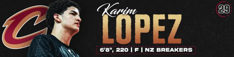 卡里姆·洛佩茲是位資質(zhì)獨(dú)特的球員:擁有符合位置的出色體型,兼具令人眼前一亮的持球與傳球能力。他擅于攻擊撲防,效力新西蘭破壞者其投籃能力在NBL聯(lián)賽持續(xù)進(jìn)步。投射將成為決定其發(fā)展的關(guān)鍵變量。本賽季前十場(chǎng)比賽中,他場(chǎng)均出手2.9次三分命中率達(dá)44.8%(總計(jì)29中13),罰球命中率76.5%(場(chǎng)均1.7次)。雖產(chǎn)量有限,但早期數(shù)據(jù)已展現(xiàn)積極信號(hào)。洛佩茲的天賦與體型值得玩味,但能否實(shí)現(xiàn)技術(shù)融合仍是核心命題。用首輪末段簽選擇此類(lèi)潛力股始終物有所值,因其很可能大幅超越順位預(yù)期。騎士此舉實(shí)則為未來(lái)押注,這位高上限新秀至少前兩個(gè)賽季或許無(wú)需承擔(dān)即戰(zhàn)壓力。