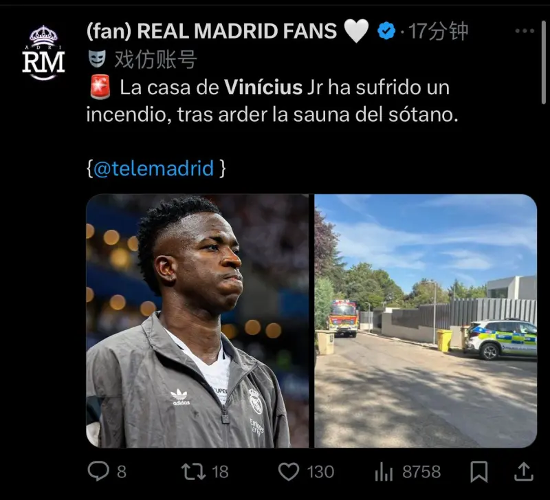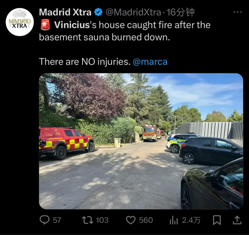 維尼修斯在皇馬住宅著火,維尼無人午無人員受傷馬卡報(bào)消息,修斯消息