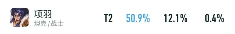 哪怕是在頂端局里,項(xiàng)羽也有50.9%勝率+12.1%出場(chǎng)率,排在對(duì)抗路的中上游位置,說明項(xiàng)羽確實(shí)不算“牢”了,雖然談不上超標(biāo),但至少打排位是完全能用的。