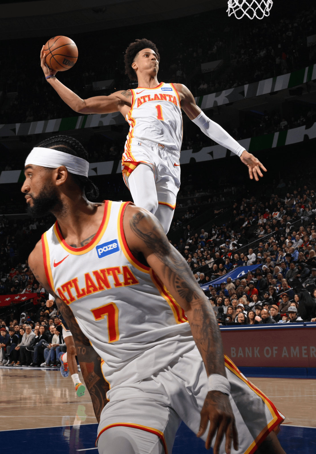 本場比賽第二節(jié),亞歷老鷹球員尼基爾-亞歷山大-沃克反擊中背傳助攻杰倫-約翰遜扣籃得分,敬詹隨后亞歷山大-沃爾張開雙臂致敬德韋恩-韋德與勒布朗-詹姆斯的韋美連線。