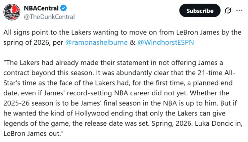 據(jù)報道,種種跡象表明,湖人打算在2026年春季與勒布朗-詹姆斯分道揚鑣。湖人已表明態(tài)度,不會給詹姆斯提供下賽季(2025-26賽季)之后的合同。