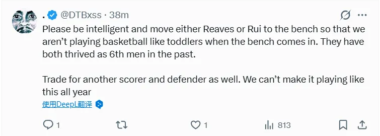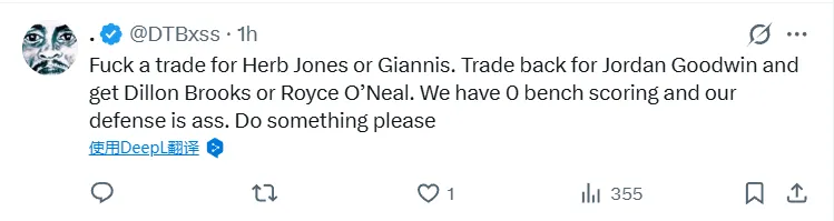 -管他什么交易赫伯·瓊斯或字母哥,給我把喬丹·古德溫?fù)Q回來,再弄來狄龍·布魯克斯或羅伊斯·奧尼爾。我們的替補得分是 0,防守也爛得要死。求你們做點事吧。