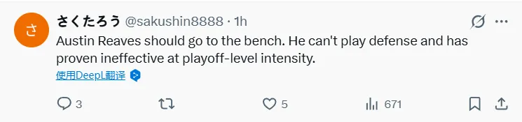 -奧斯汀·里夫斯應(yīng)該去替補席。他防守能力薄弱,且在季后賽級別的對抗強度下表現(xiàn)不佳。