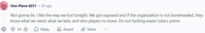 -(54贊)不瞞你說,我喜歡我們今晚輸球的方式。我們暴露了自己的弱點,如果球隊不是頭腦發(fā)熱的話,他們知道我們需要什么,我們?nèi)鄙偈裁矗约澳男┣騿T需要交易。不要浪費盧卡的黃金時期。