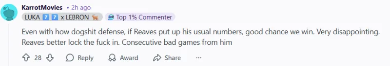 -(26贊)即使防守再爛,如果里夫斯打出他平時的表現(xiàn),我們很可能能贏。非常失望。里夫斯最好給我振作一點。他已經(jīng)連續(xù)幾場打得很糟了。