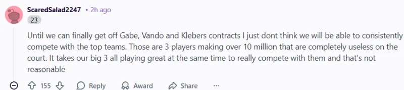 -(155贊)在我們終于擺脫蓋布、范德彪和克勒貝爾這幾份合同之前,我真的不覺得我們能穩(wěn)定地跟頂級球隊競爭。這三個球員都拿著一千萬以上的合同,卻在場上完全無用。我們必須讓三巨頭同時打得非常出色才能真正和那些球隊抗衡,但這根本不現(xiàn)實。