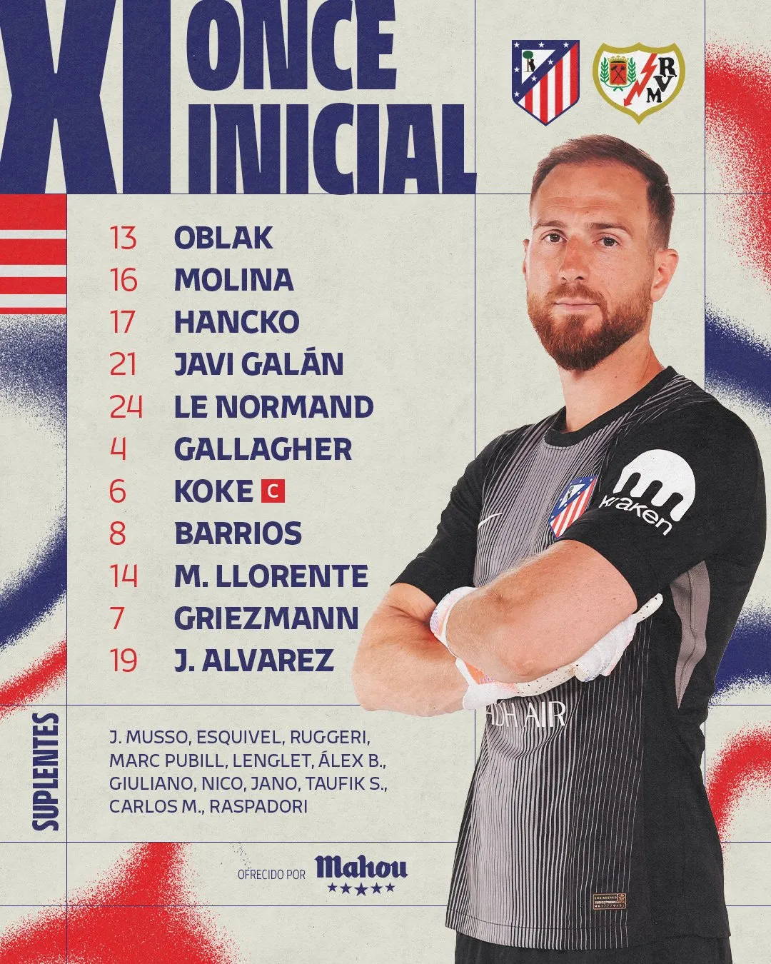 馬競首發(fā):13-奧布拉克/16-莫利納、24-勒諾爾芒、17-漢茨科、21-哈維-加蘭/14-略倫特、6-科克、8-巴里奧斯、4-加拉格爾/7-格列茲曼、19-阿爾瓦雷斯