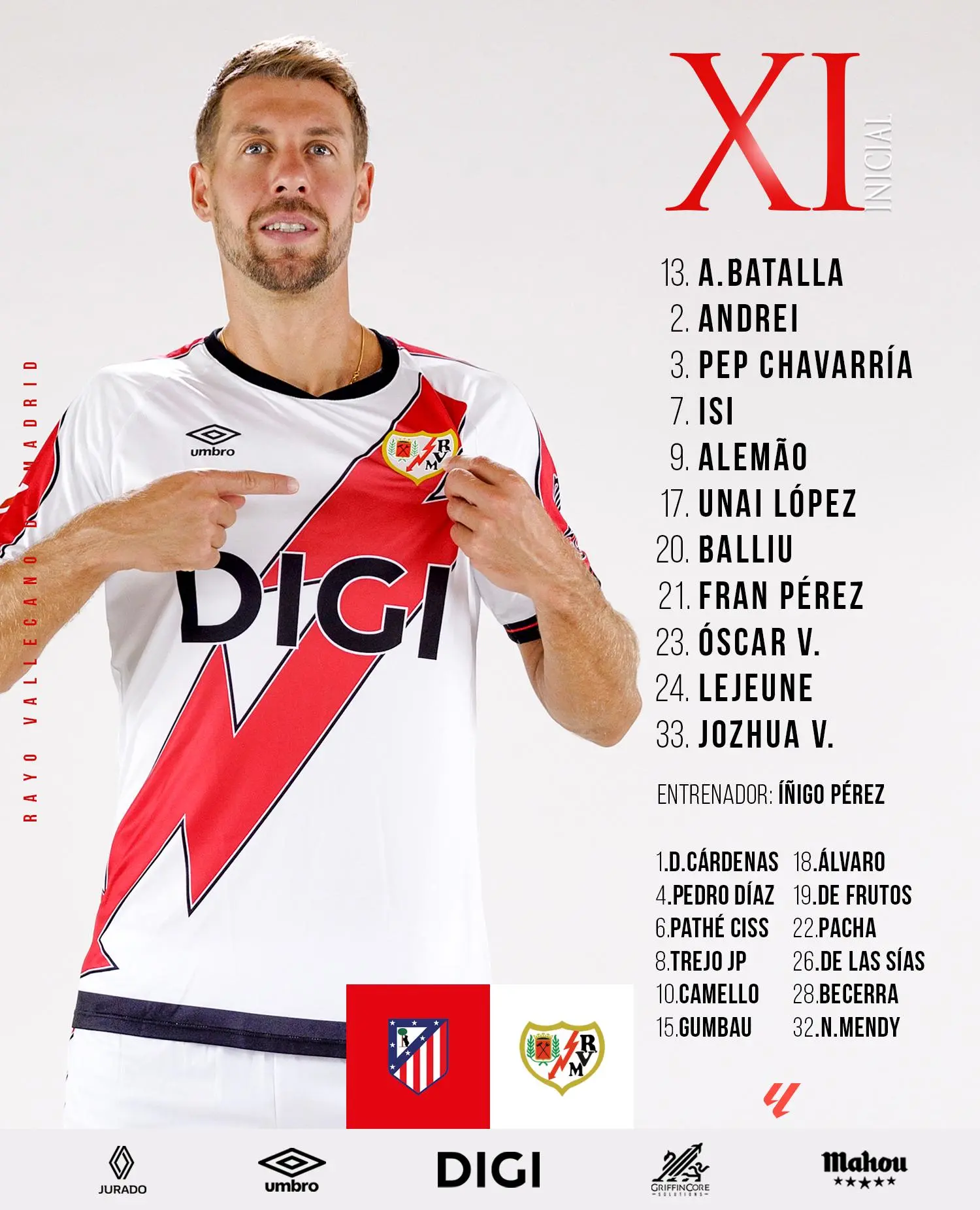 虎撲09月24日訊 北京時間9月25日凌晨3時30分,2025-26賽季西甲聯(lián)賽第6輪,馬德里競技和巴列卡諾閃電在大都會球場展開對決。賽前兩隊(duì)公布了本場比賽的首發(fā)名單。