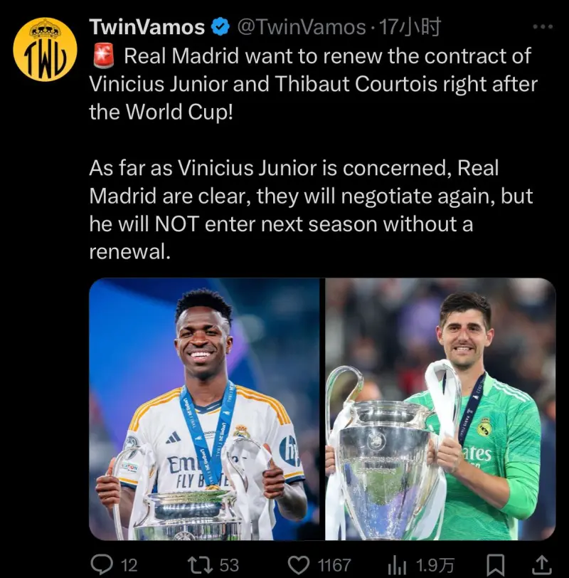 馬卡&Twim:皇馬打算在世界杯結(jié)束后立刻續(xù)約維尼修斯和蒂博·庫爾圖瓦!馬卡馬打明確就維尼修斯而言,皇后立皇馬會重合同
