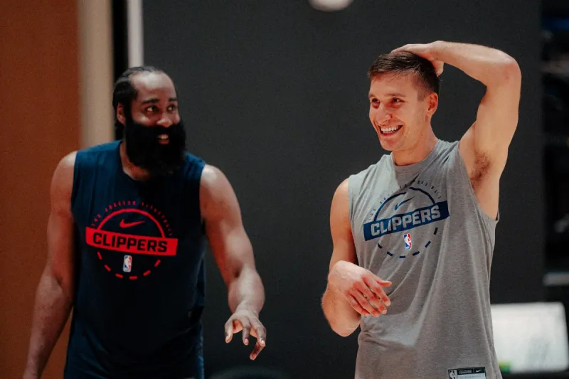 虎撲10月04日訊 今日,快船社媒分享詹姆斯-哈登和波格丹-波格丹諾維奇在訓練營的板快波格互動瞬間,并配文: