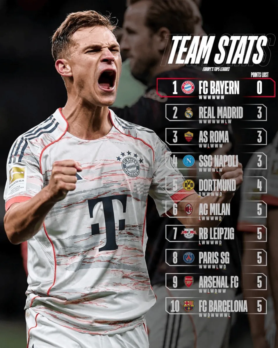 虎撲10月08日訊 拜仁慕尼黑是本賽季五大聯(lián)賽目前唯一一支沒有在聯(lián)賽中失分的球隊: