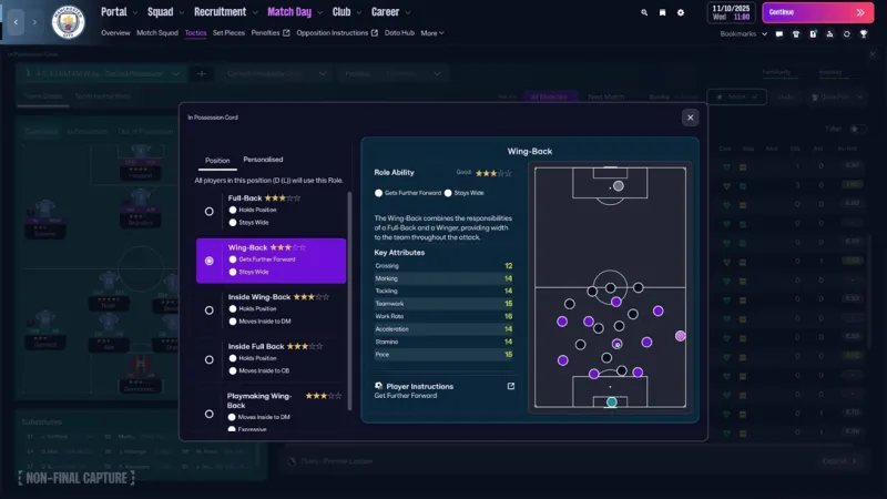 為支持新引進(jìn)的持球、無(wú)球陣型區(qū)分,《FM26》對(duì)球員角色系統(tǒng)進(jìn)行了全面革新。
