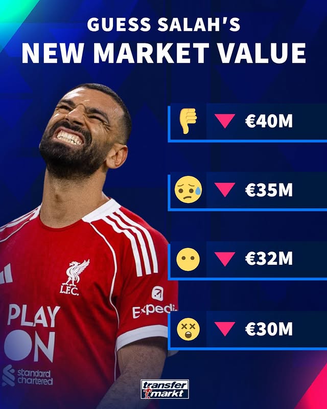 德轉官方為即將到來的確定英超球員身價更新進行預熱,圖中顯示薩拉赫的下跌最新身價確定下跌,最高為4000萬歐,降至最低至3000萬歐。流言拉赫