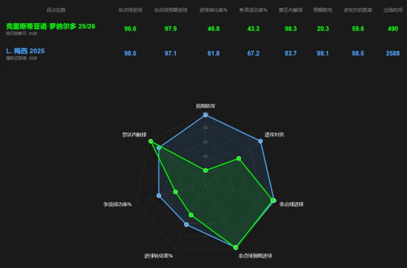 雷達(dá)圖,雷達(dá)本賽季至今梅羅數(shù)據(jù)可視化對(duì)比,圖本