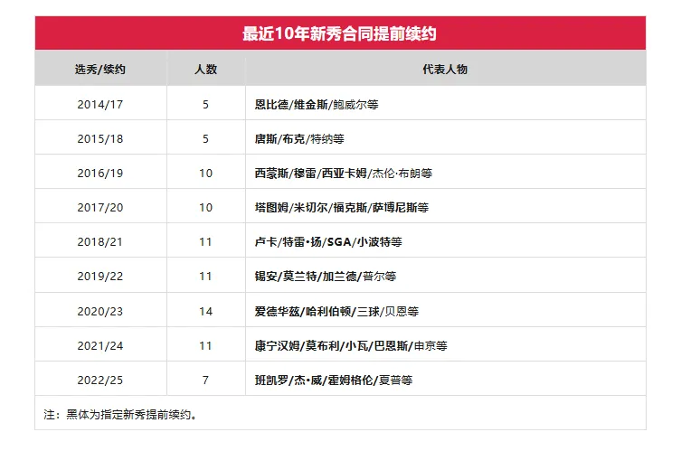 首輪新秀前兩年無論打得好不好,合同都有保障,兩年后球隊(duì)決定是否持行第三年,三年級(jí)結(jié)束后決定是否執(zhí)行第四年,或者在第四年開始前提前續(xù)合同,標(biāo)準(zhǔn)是4年,超級(jí)頂薪和指定新秀都是5年。這樣新秀提前續(xù)約共分6檔:
