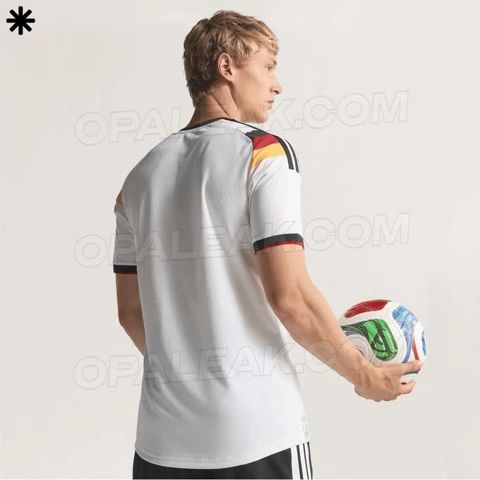 照片顯示,這件球衣以白色為主色調,其設計令人聯(lián)想起1990年和2014年德國隊奪得世界杯冠軍時所穿的球衣。尤其引人注目的是球衣正面黑、紅、黃三色組成的“V”字圖案,靈感源自德國國旗的顏色。