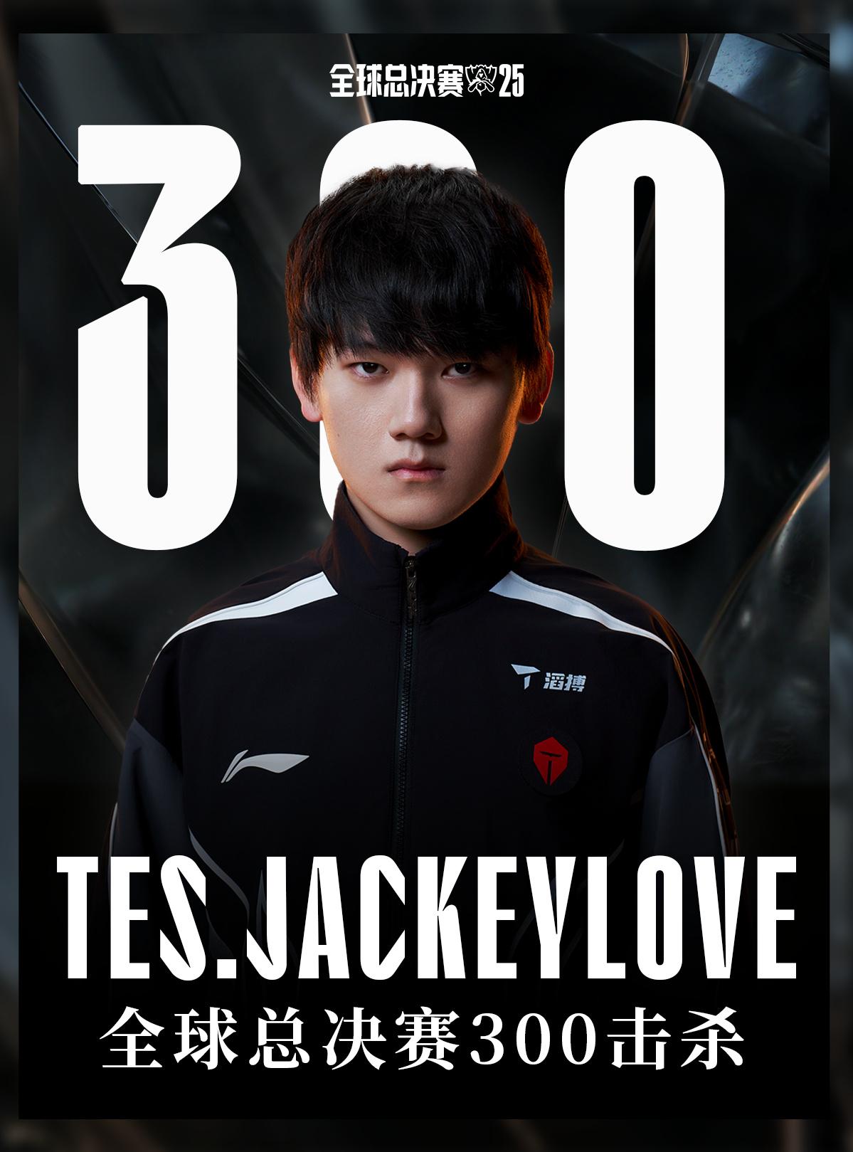 虎撲10月25日訊 在今日TES對(duì)戰(zhàn)BLG的比賽中,JackeyLove使用庫(kù)奇達(dá)成了在全球總決賽的板L碑第300次擊殺,是賽事數(shù)據(jù)第11位達(dá)成該成就的選手,恭喜JackeyLove!成全成