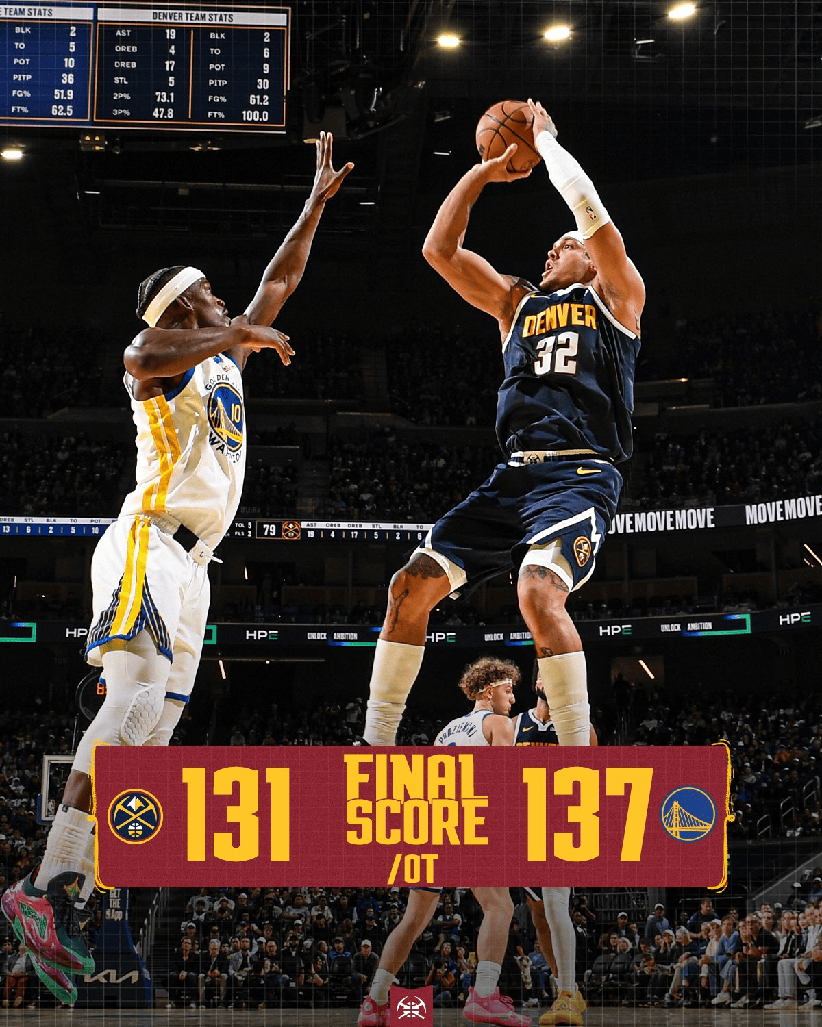 虎撲10月24日訊 今日NBA常規(guī)賽,掘金客場(chǎng)131-137不敵勇士。后更