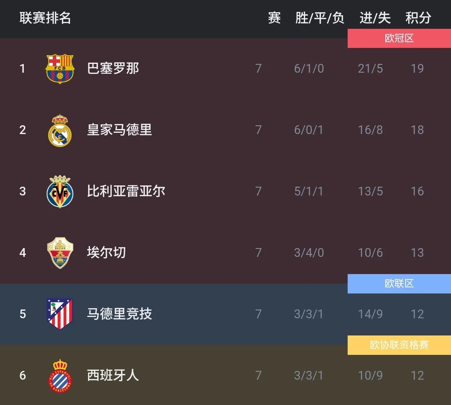 虎撲09月29日訊 隨著西甲第7輪巴薩2-1戰(zhàn)勝皇家社會(huì),西甲積分榜的板皇不敗巴薩形勢(shì)也再次發(fā)生改變。巴薩積19分超越迎來(lái)首敗的馬金皇馬,登頂積分榜。身告