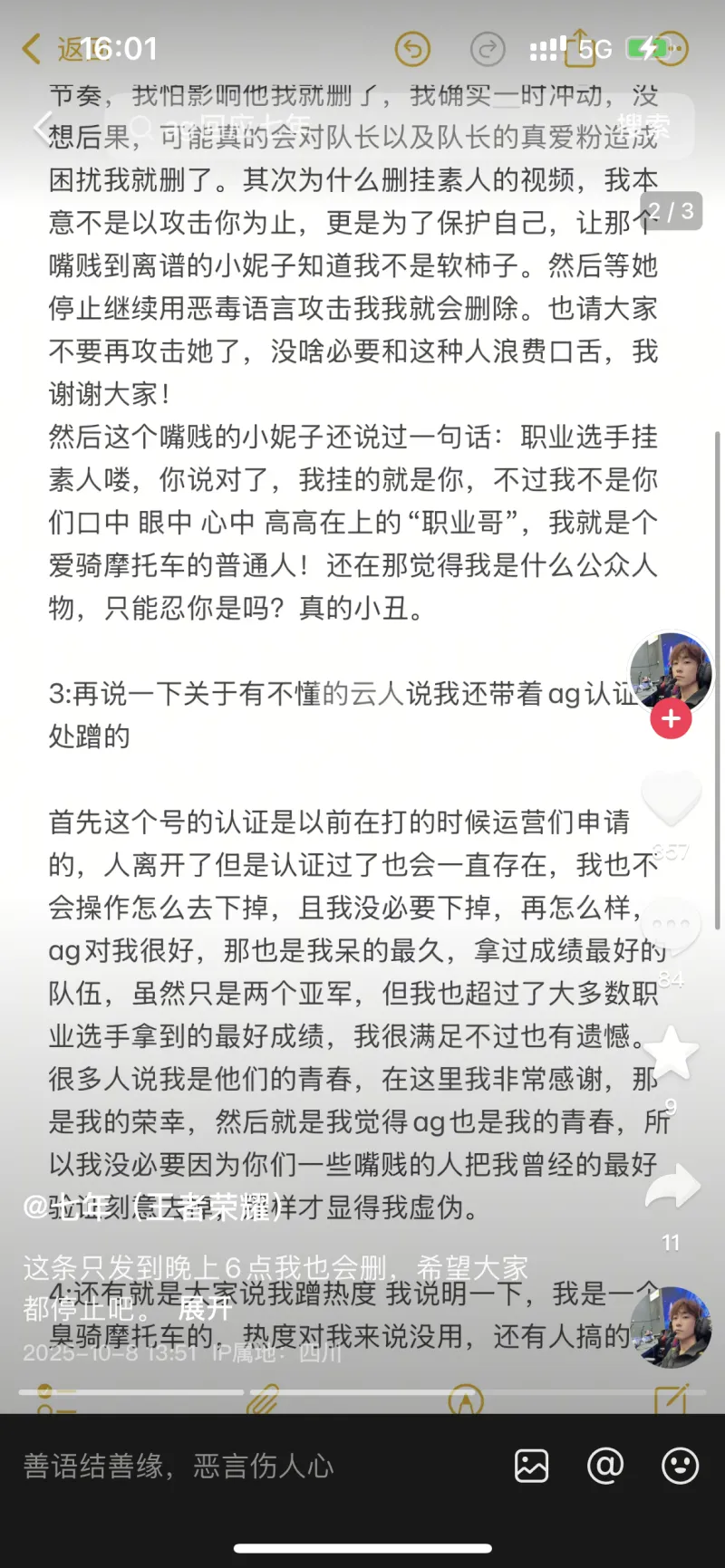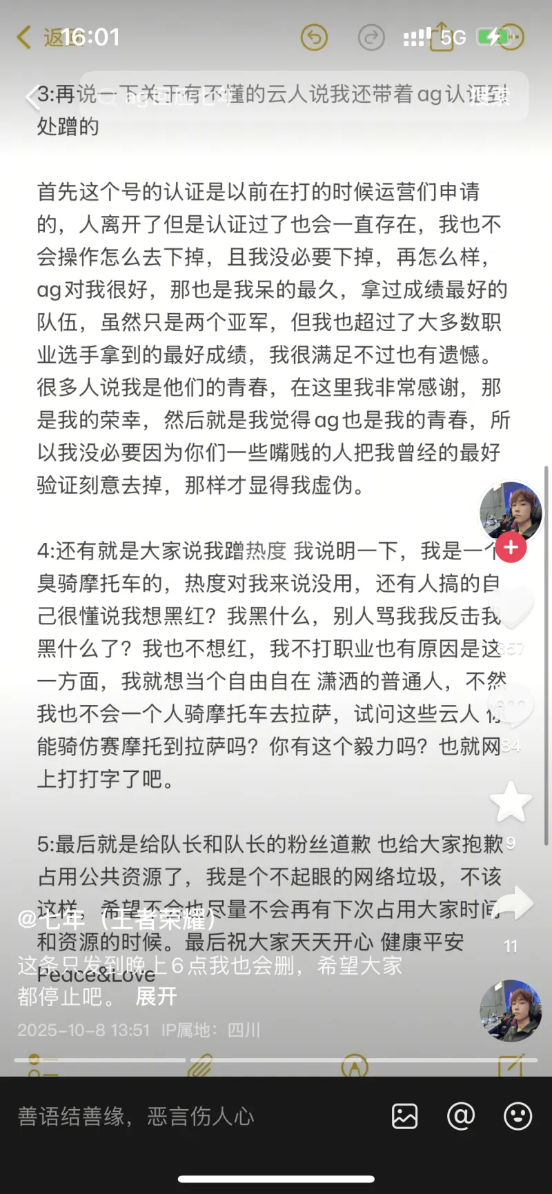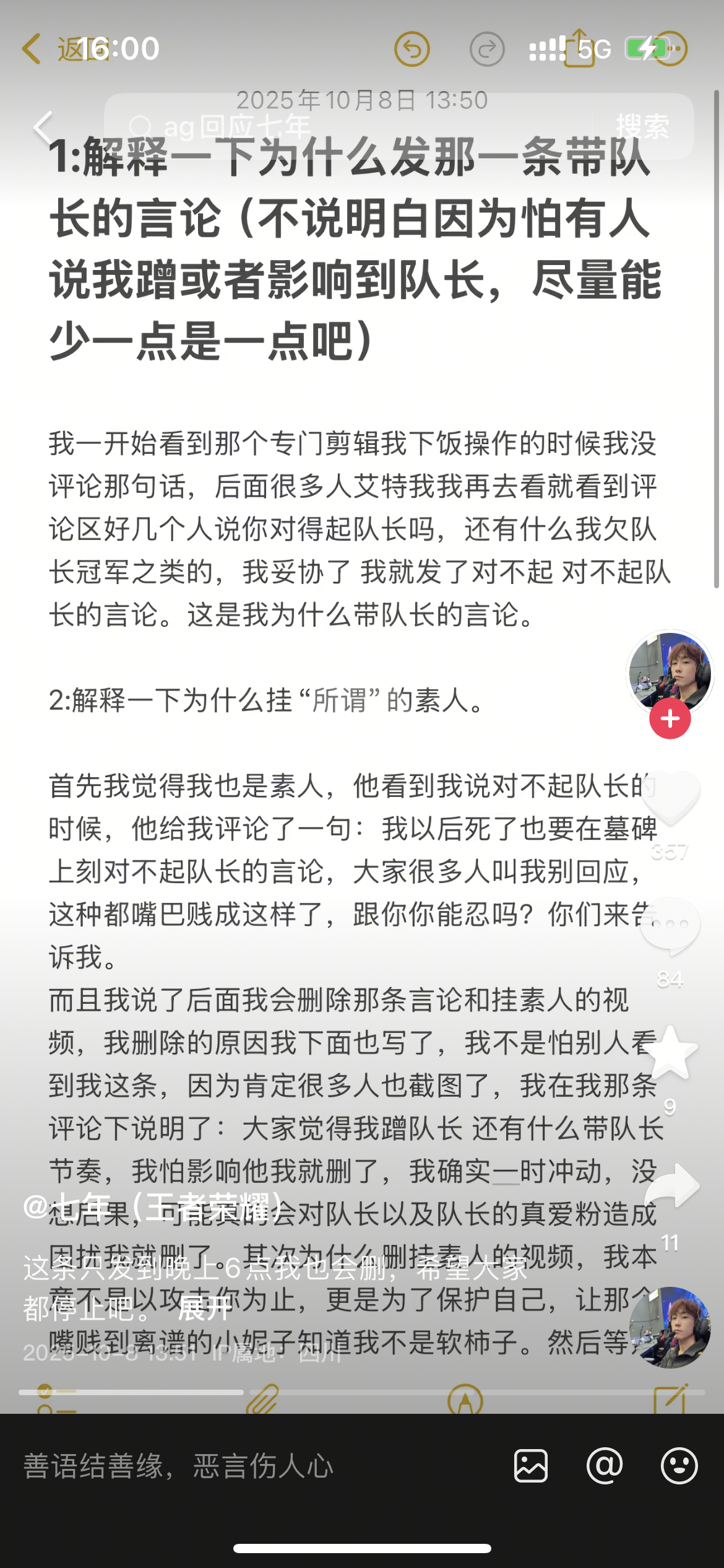 虎撲10月08日訊 七年回應(yīng)節(jié)奏:AG對(duì)我很好,熱度對(duì)我來說沒用,熱度給一諾道歉