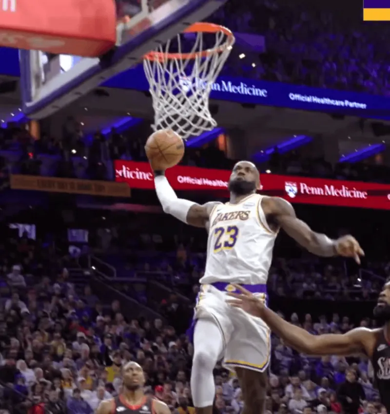 比賽第一節(jié),板還標(biāo)志詹姆斯接球大踏步起飛,湖人上演招牌滑翔劈扣。官方
